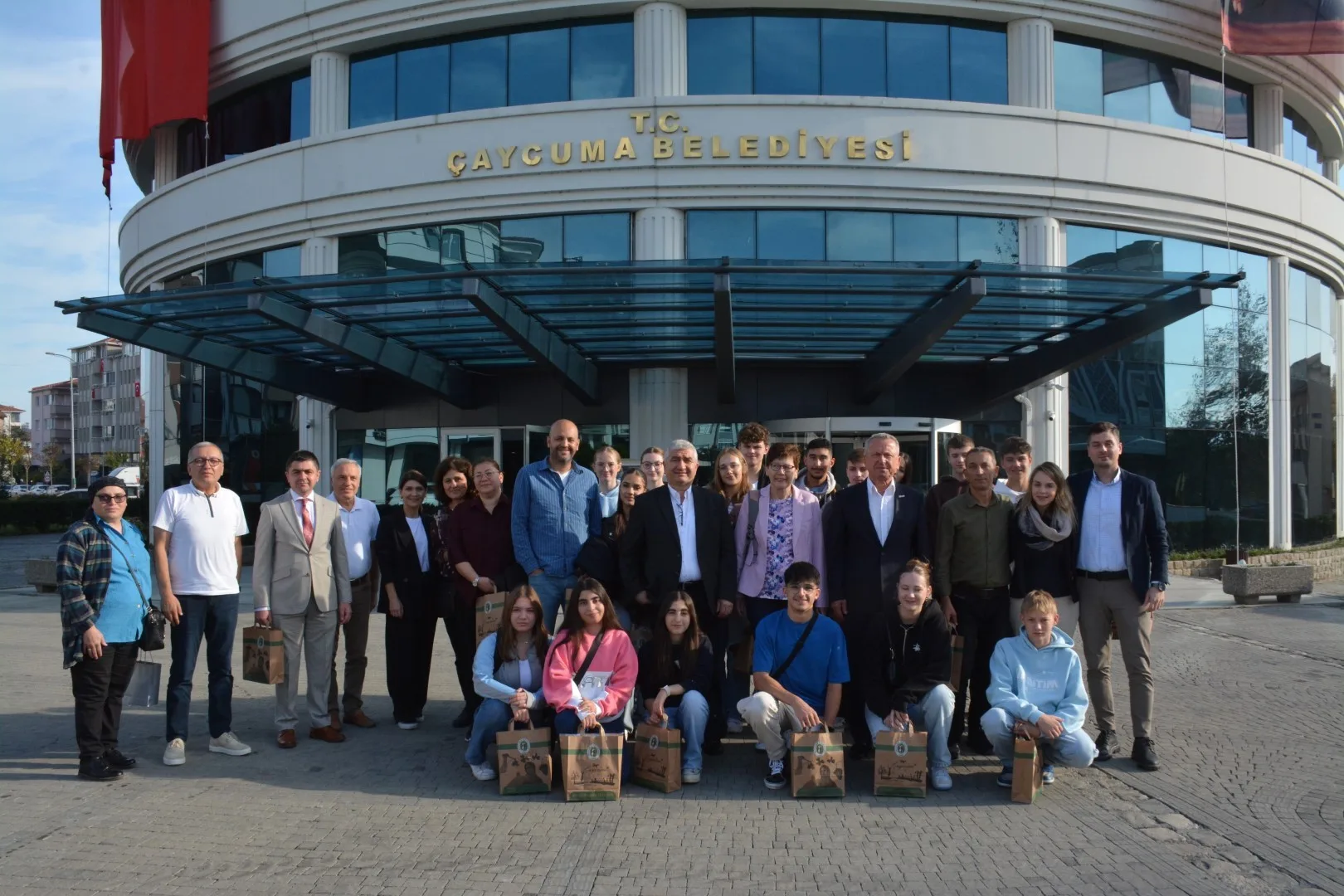 Oktay ve Olcay Yurtbay Lisesi’nin konuğu olarak gelen 16 öğrenci, 2 öğretmenden oluşan Gymansium Der Stadt Lennesdat okulu heyeti, lise Müdürü Oktay Aksoy ve öğretmenleri ile birlikte ziyaretin son gününde Çaycuma Belediyesine geldi. Konuklarını Çaycuma Belediyesi Meclis Salonu’nda ağırlayan Çaycuma Belediye Başkanı Bülent Kantarcı, heyeti burada görmekten duyduğu memnuniyeti dile getirdi. Ziyarette Lennestadt Belediyesi Uyum Meclisi Başkanı Nedim Kalembaşı, eşi Nurhan Kalembaşı oğlu Caner Kalembaşı, Lenenstatst-Çaycuma Dostluk Grubu Üyesi Recep Karagöz ve bazı dair amirleri de hazır bulundu.