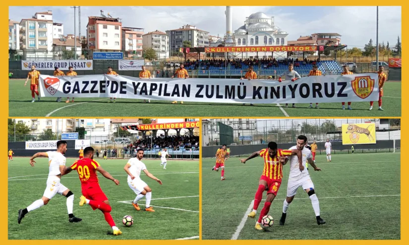 Malatya’da Bölgesel Amatör Futbol Liginde Malatya’yı temsil eden, Malatyaspor Pazar günü Yeşiltepe stadında Kayseri temsilcisi Develi spor ile karşı karşıya geldi. karşılaşma öncesi Malatyaspor Gazze’de yapılan zulmü kınıyoruz pankartla çıktılar.