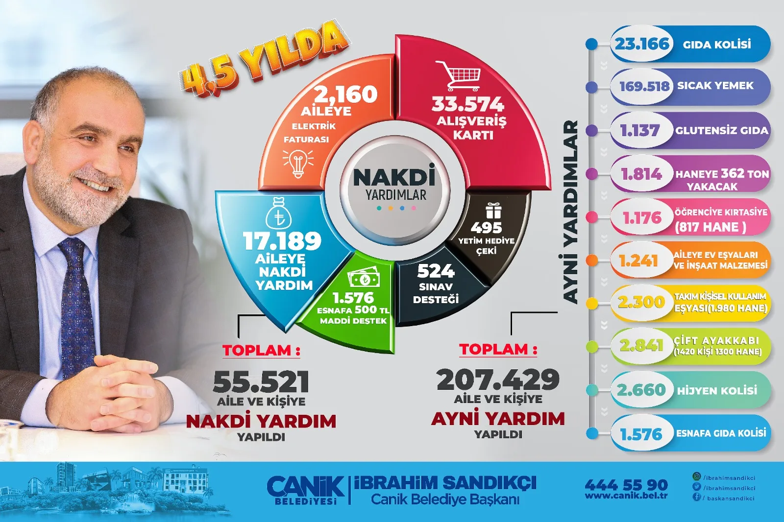4.5 yıl içerisinde ayni yardımlarla birlikte nakdi yardımların da kesintisiz bir şekilde devam ettiğine işaret eden Başkan İbrahim Sandıkçı, “ Canik’imizde 4.5 yıl içerisinde ayni yardımlarımızla birlikte nakdi yardımlarımızı ara vermeden sürdürdük. 4.5 yılda ihtiyaç sahibi