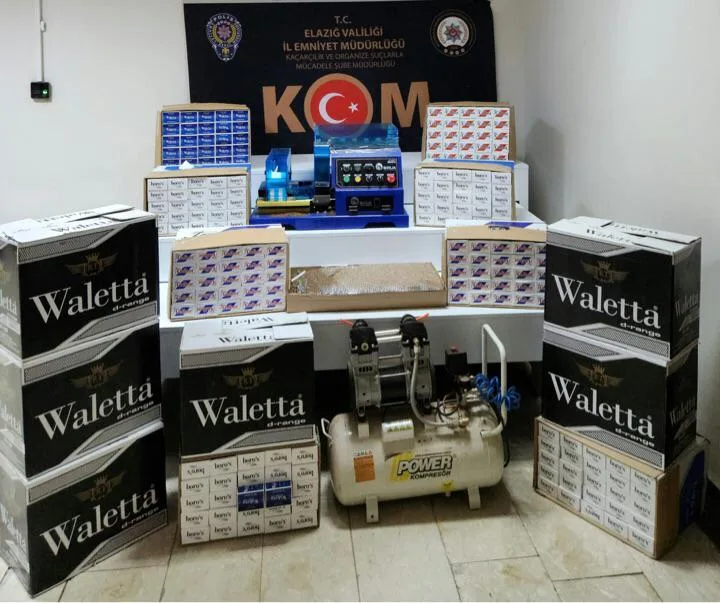 Elazığ Cumhuriyet Başsavcılığı koordinesinde, İl Emniyet Müdürlüğü Kaçakçılık ve Organize Suçlarla Mücadele Şube Müdürlüğü tarafından, Tütün Mamulleri Kaçakçılığına yönelik 5 Ocak 2024 günü yapılan operasyonda; 2 şüpheli şahsın yapılan ikamet ve iş yeri aramasında; 730 karton bandrolsüz makaron, 150 karton geçersiz bandrollü makaron, 190 karton doldurulmuş makaron, 5000 adet doldurulmuş makaron, 1 adet tütün sarma makinesi ele geçirildi.