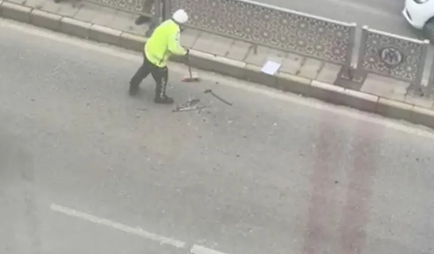 24 EC 289 ve 16 JOS 06 plakalı araçların karıştığı kaza sonrasında, polis memuru diğer araçlara zarar vermemesi için yolları süpürerek örnek bir tutum sergiledi.