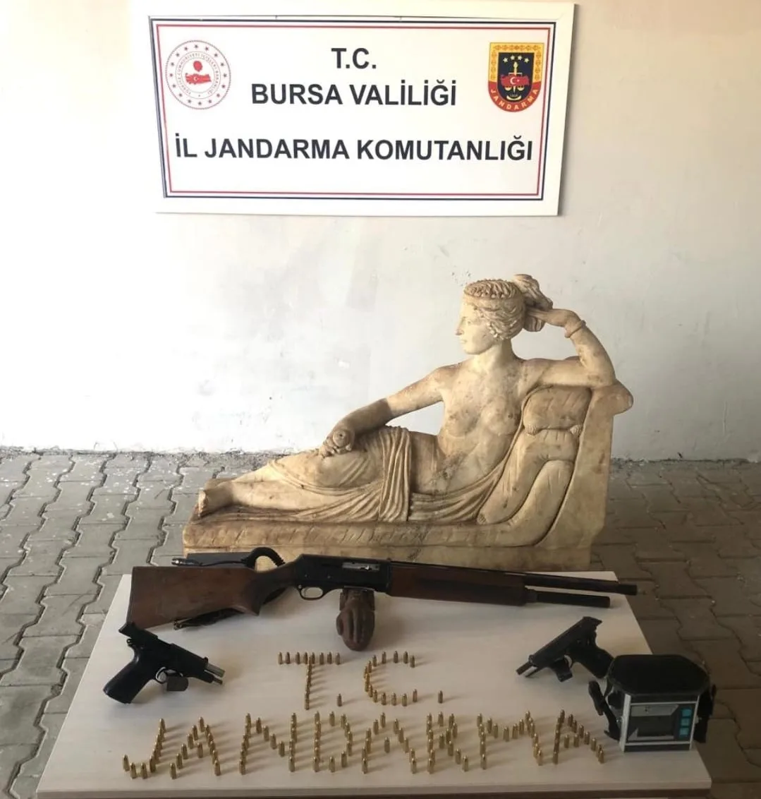 Bursa İl Jandarma Komutanlığı ekipleri İnegöl’ün Fevziye Mahallesi’nde bir eve operasyon düzenledi. Operasyonda didik didik aranan evde, tarihi eser heykel ele geçirildi. Aramalarda 2 tabanca ile bir tüfek de bulundu.