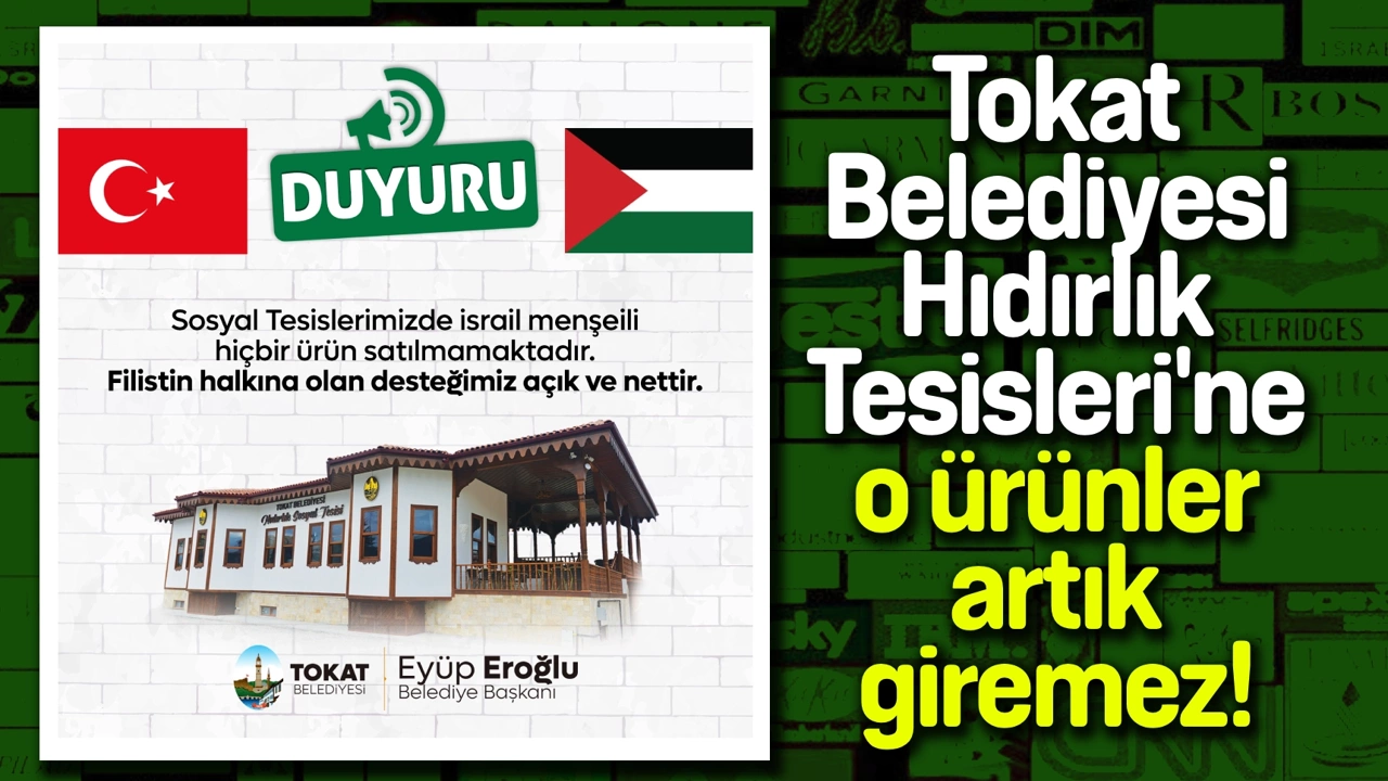 Tokat Belediye Başkanı Eyüp Eroğlu, belediye bünyesinde hizmet veren Hıdırlık Sosyal Tesislerinde İsrail menşeli hiçbir ürünün satılmayacağını duyurdu.