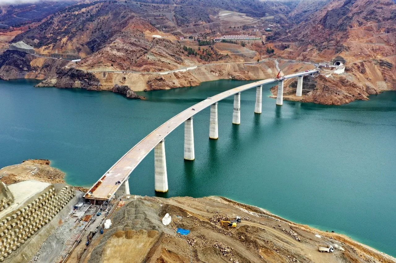 Yusufeli ilçesinde yeni ilçe merkezine ulaşımda önemli rol oynayacak olan merkez viyadüğünün de oldukça önemli olduğunu belirten Bakan Uraloğlu, “Yeni ilçe merkezini mevcut kara yoluna bağlayacak olan baraj gölü üzerinde 150 metre yüksekliğinde 685 metre uzunluğunda, dengeli konsol ve dökme sistemi kullanılarak inşa edilen viyadük için çalışmalarımız hızla sürüyordu. Çalışmalarda artık sona geldik.” İfadelerini kullandı.